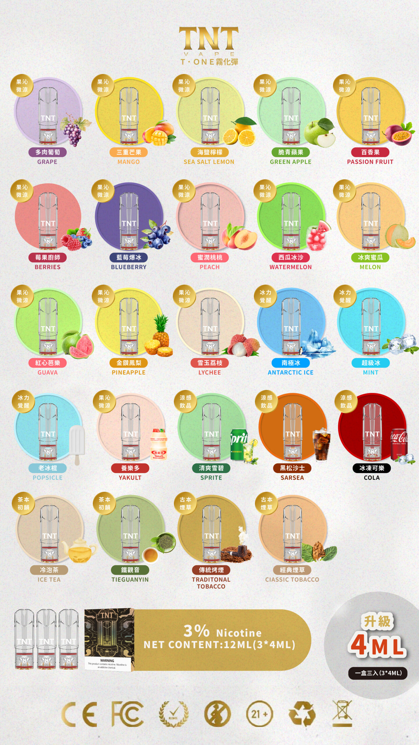 TNT煙彈讓您的吸煙體驗升級!每顆煙彈擁有 4ml大容量,每盒 3顆,滿足您全天的吸煙需求,讓您暢快享受無間斷的吸煙樂趣。擁有 26種人氣口味,包括水果、薄荷、飲料、茶感、煙草等全方位選擇,無論您是新手還是老煙客,都能找到最適合您的口味!3%尼古丁濃度,濃郁不嗆喉,讓每一口都滿足您的菸癮需求。